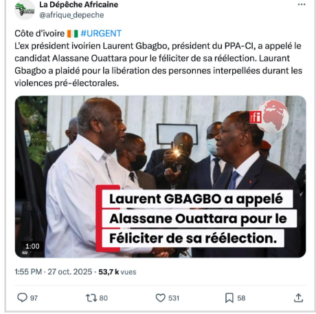 Une vidéo manipulée fait croire que Laurent Gbagbo a félicité Alassane Ouattara pour sa réélection